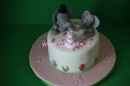 La parte centrale dei fiori sono decorati con diamanti di zucchero che trovate su http://www.cakecraftshop.co.uk/shop/products/id/sqed09a01001.htm . Purtroppo le temperature alte delle ultime settimane hanno intaccato la lucentezza dello zucchero, ma erano carini comunque. L’elefantino sposo porta un cilindro nero, mentre l’elefantina sposa ha una coroncina di fiori. C’è anche un splendida wedding cake con più piani che svetta fra gli sposi.