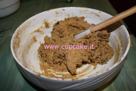 in una zuppiera, mischiare la farina, il bicarbonato ed il sale. In un’altra zuppiera mettete il burro ed entrambi gli zuccheri e miscelare finché non sono ben amalgamati. Aggiungere le uova una alla volta e l’estratto di vaniglia. A questo punto bisogna versare gli ingredienti asciutti fino ad ottenere un impasto omogeneo. Versare le scaglie di cioccolato, ma tenetene una manciata da parte.