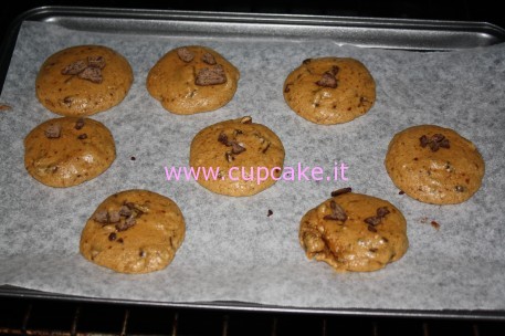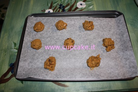Dividete l’impasto in palline, se la temperatura è alta mettete l’impasto in frigo 10/15 minuti prima di infornare. Ricordate di lasciare un po’ di spazio fra una pallina ed un’altra. Durante la cottura i biscotti si allargheranno.