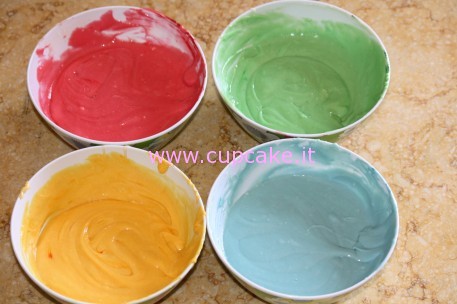 Dividete l’impasto in varie ciotoline, io ne ho usate 4 poichè avevo scelto altrettanti colori: giallo, rosa, verde chiaro e celeste.
